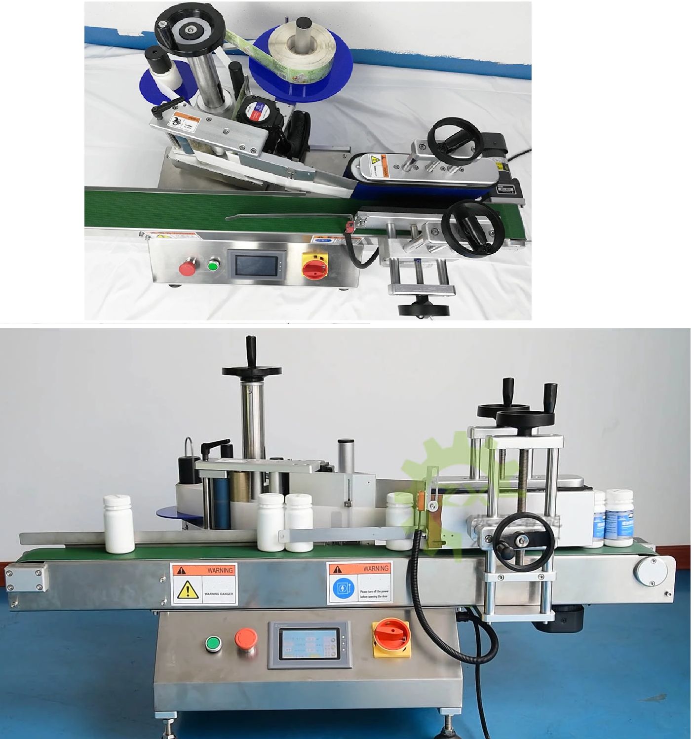 Semi-automatic adhesive label gluing equipment for applying labels to cylindrical objects.